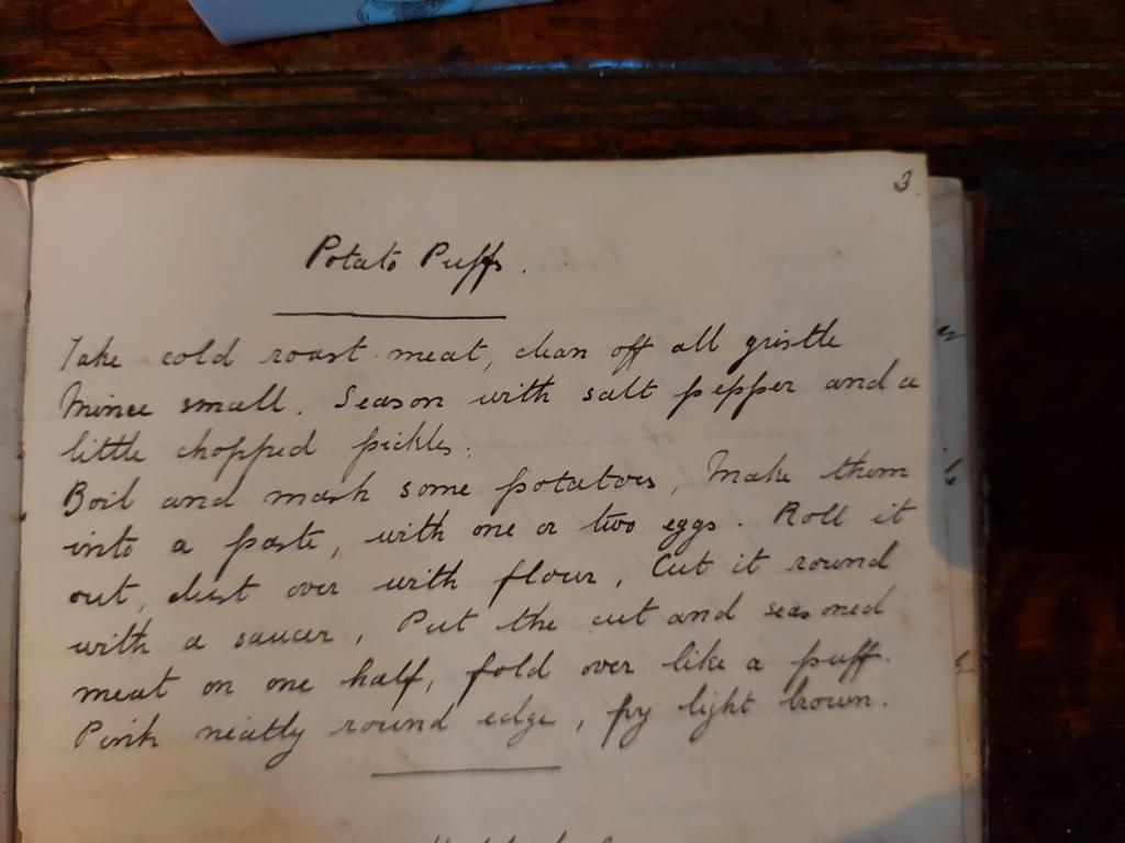“Potato Puffs. Take cold roast meat, clean off all gristle. Mince small. Season with salt, pepper and a little chopped pickles. Boil and mash some potatoes, make them into a paste, with one or two eggs. Roll it out, dust over with flour. Cut it round with a saucer. Put the cut and seasoned meat on one half, fold over like a puff. Pink neatly round edge, fry light brown.”