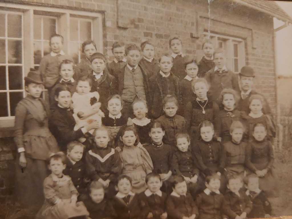In 1891, when Harriet was a pupil, Thomas Kingdon and his wife Blanche were living at the school house and are recorded as being ‘elementary teachers’. They look about the right ages to be the couple featured in this photograph of the school, which is in my mother’s collection and dated as c.1890. My mother has marked Harriet as being the girl almost in the centre, wearing all black and with something in her hair and it certainly resembles later photographs of her. She also thought that the boy third from the left on the back row could be her brother, Herbert (matching brows!) This is the only photograph of Harriet as a child.